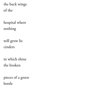 As the website points out, the poem is one sentence, with no capital letter or full stop, broken into ten lines. The metaphor of a poem being broken is aready a clue as to how enjambement proceeds: through fragmentation, separation. Enjambement is a structural strategy: it might involve, one assumes, playing and experimenting with how meaning is affected when the parts of an expression – a sentence – are devolved, moved down, taken away and pushed further on; poetry as an experiment in spatial and temporal composition as well as linguistic. ‘Composition,’ Deleuze and Guattari (2015) wrote, ‘is the definition of a work of art’. Broken line, ‘broken / pieces of a green / bottle’. Suspended and postponed, the delay of the next line creates tension, suspense; there is something pitiful, tragic, about ‘the back wings’, where ‘cinders’ – ash, burnt material – are the only material object to fill a whole line, or for the line to be full of only ash, full of only ‘cinders’. Mirroring the ‘broken / pieces of a green / bottle’, the sentence is chopped, stopped as we proceed we are, poetry having recourse to the reconfiguration of sense through space and deployment of emotion through this postponement of the line, as we read the poem differently – with more difficulty – than we would usually do the “bare line”.